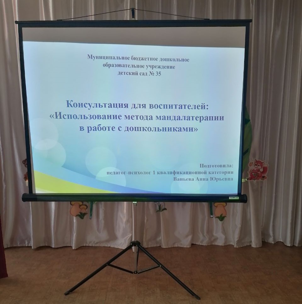 В понедельник 30 октября, педагог-психолог Ваньева А.Ю. провела консультацию для педагогов «Использование метода мандалатерапии в работе с дошкольниками». Цель консультации - познакомить педагогический коллектив с техникой мандалатерапии, как инструмента для снятия психоэмоционального напряжения и профилактики психического здоровья у детей. В ходе консультации, педагоги познакомились с мандалой и новым направлением арт-терапии мандалатерапией. Они узнали, чем мандалы полезны для детей, с какого возраста их можно использовать в работе с детьми, какие формы и методы работы с мандалами существуют, а также каких правил нужно придерживаться, в процессе работы с детьми. Для большей наглядности была оформлена презентация.