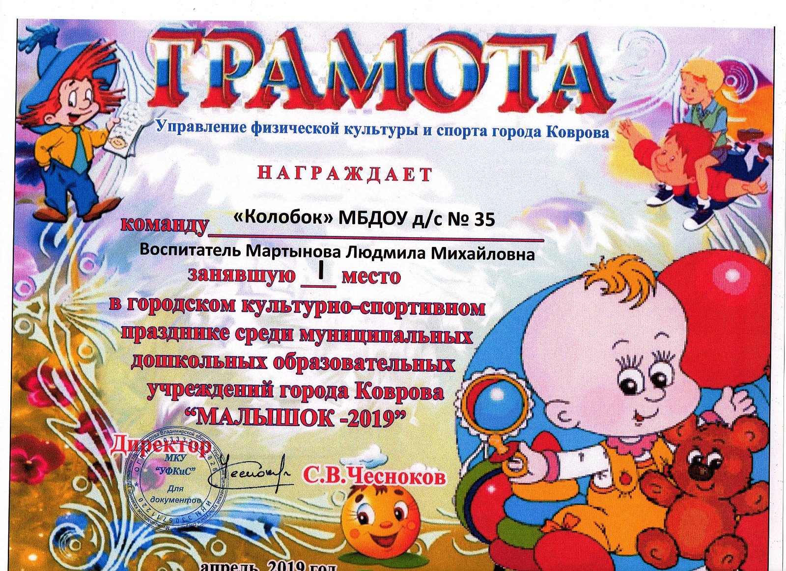8 апреля в СК "Звезда" команда "Колобок", состоящая из воспитанников подготовительной к школе группы (под руководством Мартыновой Л.М.),и представляющая МБДОУ № 35, приняла участие в традиционных городских соревнованиях "Малышок". В нелегкой борьбе ребята заняли призовое 1 место. Физкульт - УРА, УРА, УРА!!!